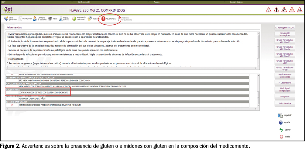Como conclusión, mediante la codificación de la composición de los medicamentos autorizados por la AEMPS, tanto de principios activos como de excipientes de declaración obligatoria, y la inclusión de mensajes de advertencia en Bot PLUS, el farmacéutico comunitario puede identificar aquellos medicamentos que deben usarse con precaución en pacientes celiacos, facilitando así su labor asistencial.