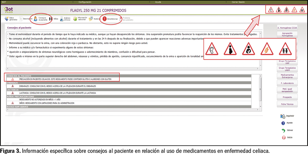 El Consejo General de Colegios Oficiales de Farmacéuticos a través de su base de datos Bot PLUS facilita la labor asistencial del farmacéutico adaptándose a sus necesidades. A través de la codificación de la composición de los medicamentos autorizados por la AEMPS y la inclusión de mensajes de advertencia, el farmacéutico puede identificar aquellos medicamentos que deben usarse con precaución en pacientes celiacos.