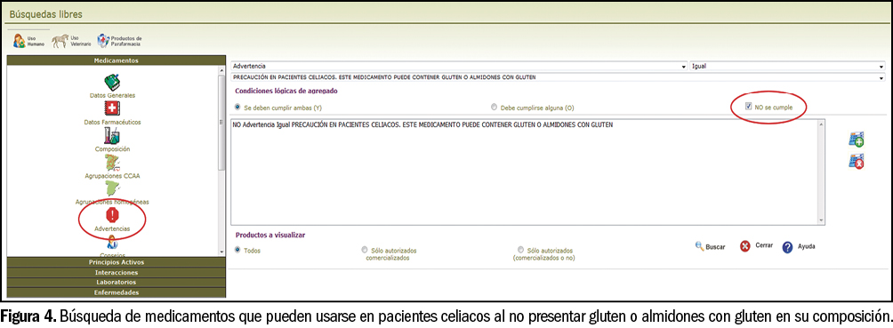 En el caso de querer obtener un listado de aquellos medicamentos que no contienen gluten o algún derivado de gluten en su composición, en la búsqueda explicada anteriormente, antes de añadir el mensaje relacionado con la enfermedad celiaca, marcaríamos “NO se cumple” (Figura 4).