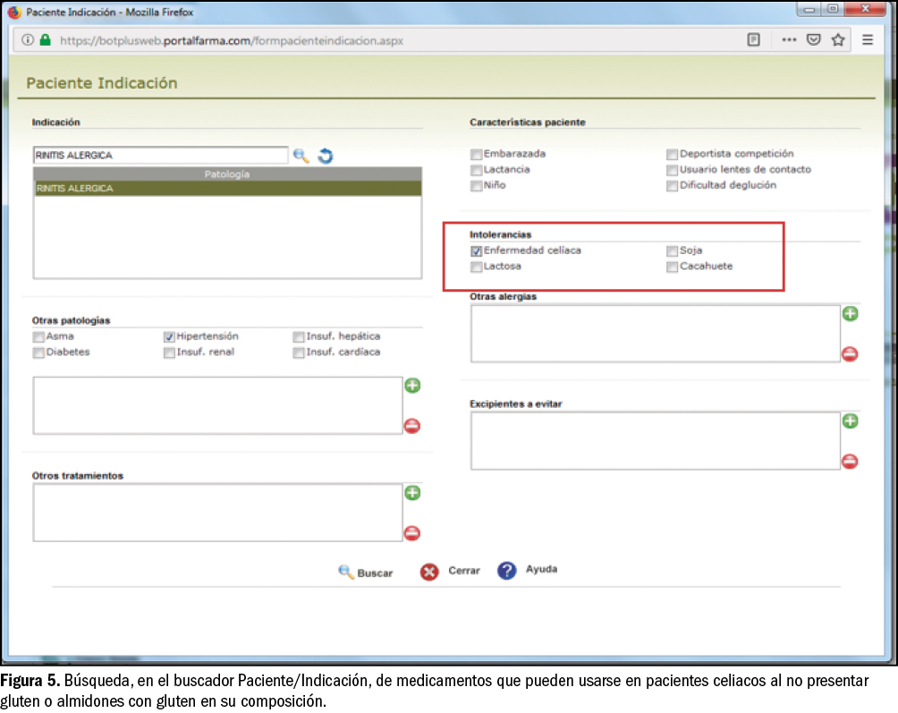 En este buscador introduciremos tanto la indicación para la cual se está realizando la búsqueda como otras patologías, tratamientos, características del paciente, intolerancias, alergias y excipientes a evitar. En este caso, en el apartado de intolerancias seleccionaremos “enfermedad celiaca” y por lo tanto, todos los medicamentos que se obtengan en la búsqueda para la indicación concreta serán aptos (no de uso precautorio) en estos pacientes (Figura 5).