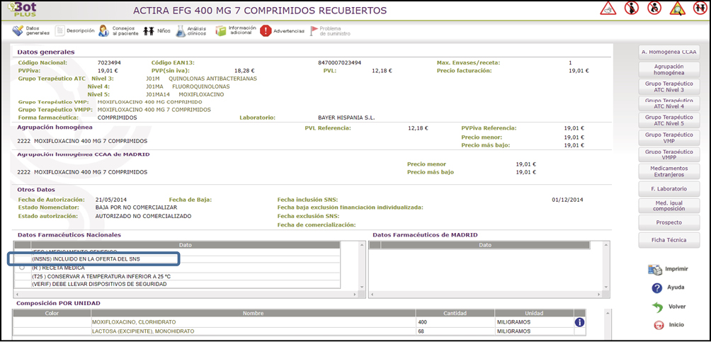 Bot PLUS es fiel reflejo de la información que contiene el Nomenclátor oficial. Es por ello que contiene determinados datos muy visuales y de ayuda para el farmacéutico. El dato “INSNS: INCLUIDO EN LA OFERTA DEL SISTEMA NACIONAL DE SALUD” identifica que el código nacional que lo presenta está incluido en el Nomenclátor de Facturación del Ministerio de Sanidad, en el mes en curso e indica que un medicamento es financiable y facturable. Este dato figura en el apartado de “Datos Farmacéuticos Nacionales” (Figura 1).