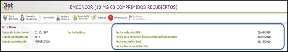 Además, Bot PLUS presenta un campo de fecha que ofrece más información sobre aquellos medicamentos que resultan desfinanciados del Sistema Nacional de Salud. Este campo se denomina: “Fecha baja exclusión financiación individualizada”. Ésta se corresponde con el momento a partir del cual el medicamento pasa, en Nomenclátor de Facturación, a “BAJA EXCLUSIÓN FINANCIACION INDIVIDUALIZADA” (“facturable”).
