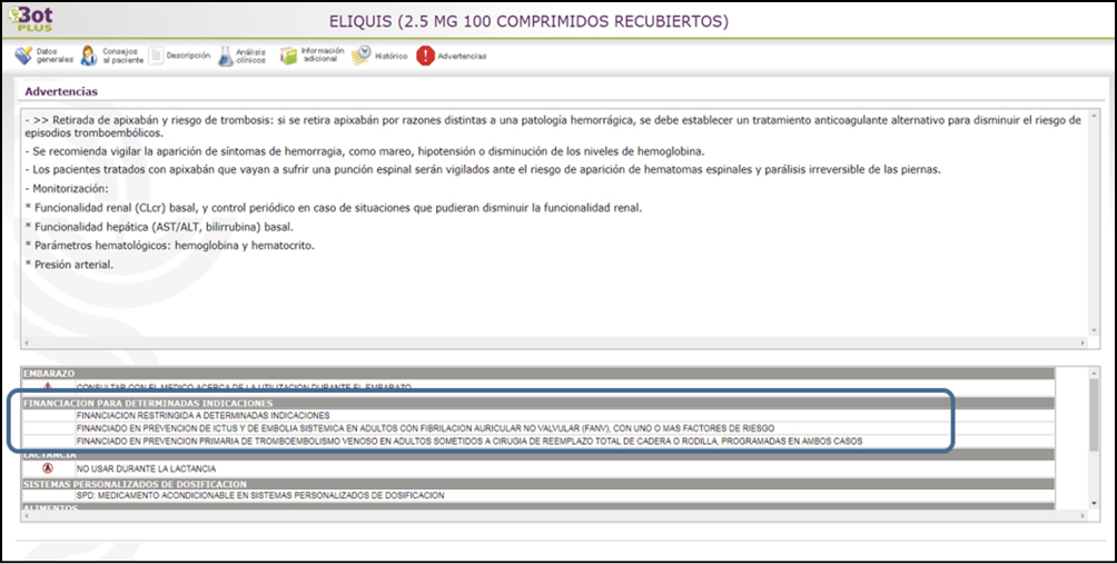 De forma complementaria, en Bot PLUS se ofrece la información particularizada sobre la existencia de medicamentos en los que no todas las indicaciones están financiadas mediante un sistema de codificación particular en el apartado de ADVERTENCIAS, donde se identifican, por un lado, aquellos medicamentos sometidos a este tipo de restricciones y por otro lado, las indicaciones concretas que están financiadas (Figura 5).
