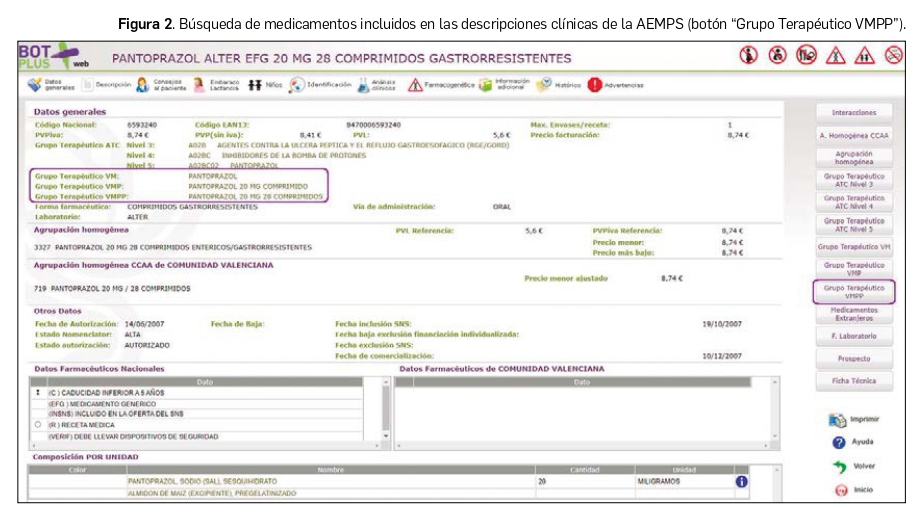 Grupo terapéutico VMPP. A través de este botón (Figura 2) se obtiene el listado de presentaciones de medicamentos que pertenecen a la misma descripción clínica, según la información aportada por la Agencia Española de Medicamentos y Productos Sanitarios, al tener el mismo principio activo, dosis, forma farmacéutica y tamaño del envase, independientemente de sus condiciones de financiación.