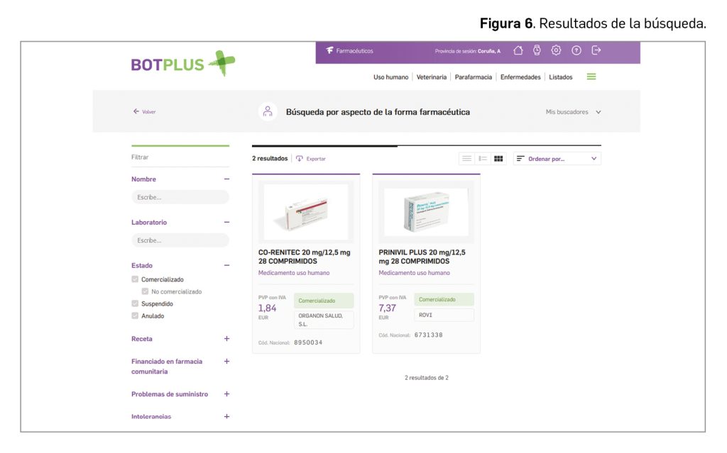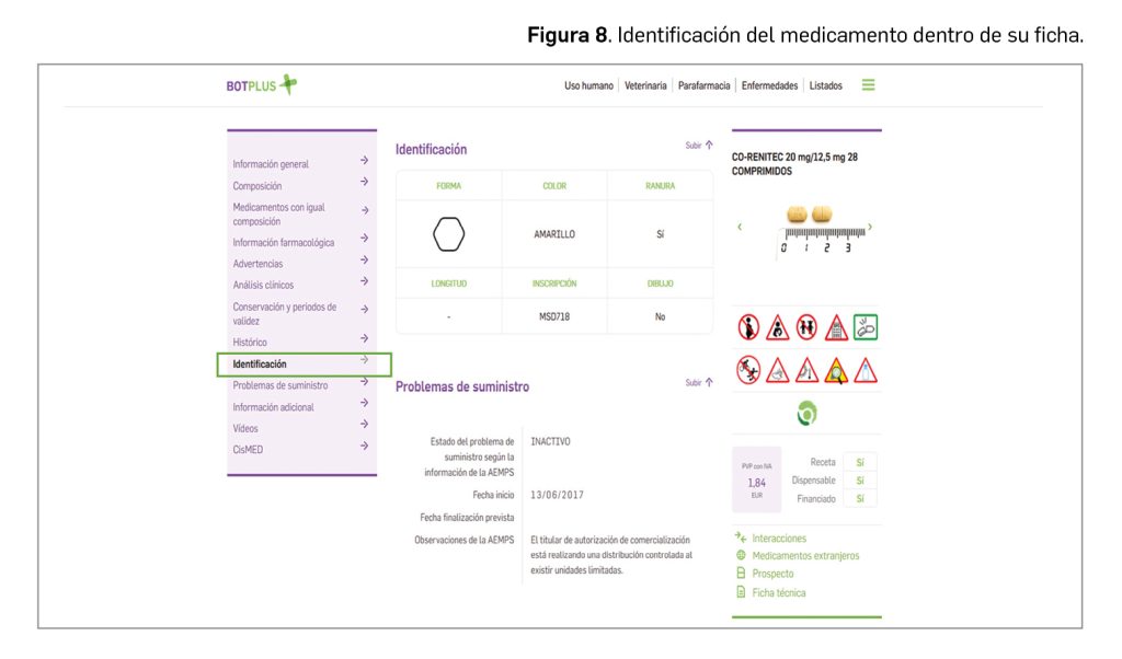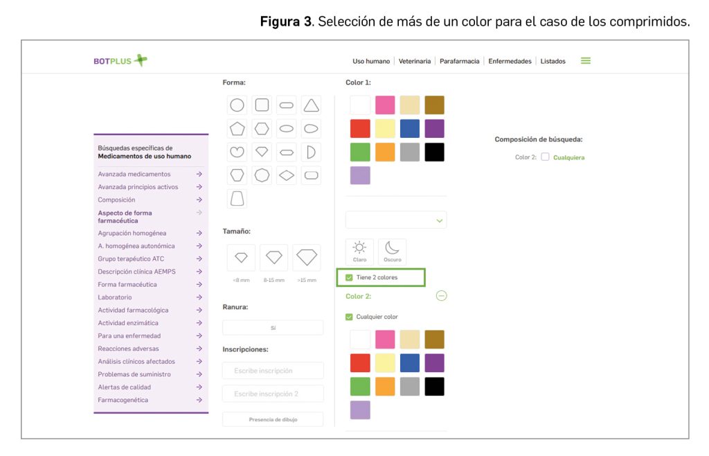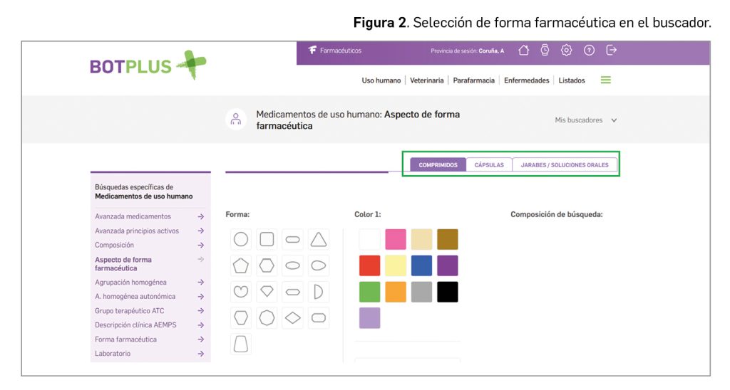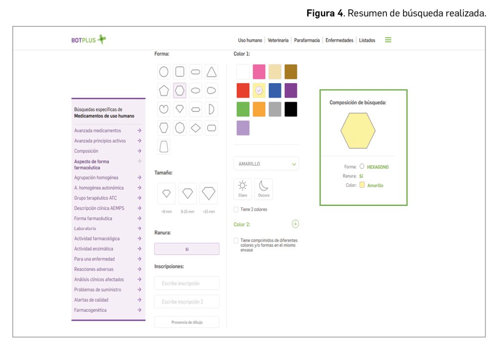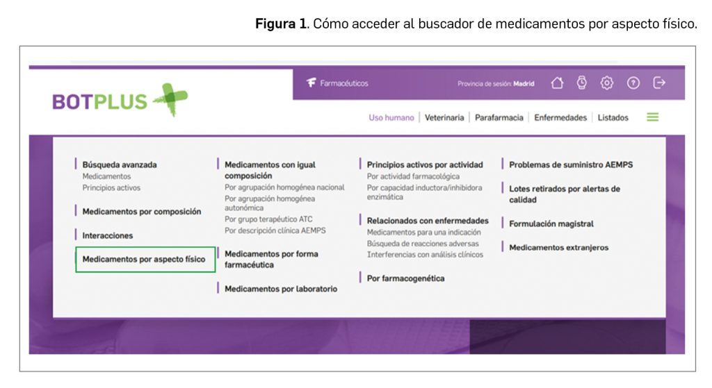 El Consejo General de Colegios Oficiales de Farmacéuticos, a través de su base de datos BOT PLUS, facilita la labor asistencial del farmacéutico adaptándose a sus necesidades. A través de la codificación del aspecto físico de los diferentes medicamentos se intenta favorecer el acceso a la identificación de las diferentes formas farmacéuticas que en ocasiones son inaccesibles debido al dispositivo de seguridad que imposibilita la apertura del envase. La actualización de contenido y progresivas mejoras introducidas en este buscador permite encontrar la medicación de nuestros pacientes que en ocasiones son capaces de identificar la forma, color, sabor y otras características físicas de su medicación e incluso la indicación para la que toman un determinado tratamiento, pero no recuerdan el nombre de su medicación.