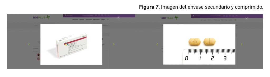 Cuando, para acabar, se clique sobre el botón Buscar, el buscador mostrará un listado de los medicamentos que cumplen los criterios introducidos (Figura 6) e incluso se podrá visualizar una imagen del envase secundario y el comprimido (Figura 7).