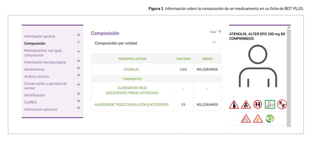 Al acceder a la ficha de un medicamento, se puede comprobar en la pantalla inicial si contiene EDO. En muchos casos, se ha incluido, además, una advertencia para aquellos medicamentos que deberían ser utilizados con precaución por pacientes que presenten alergias o intolerancias a estos excipientes (Figura 1). En algunos medicamentos se puede visualizar, incluso, un pictograma específico en la parte superior derecha de su ficha (por ejemplo, pictograma de advertencia de uso en pacientes celiacos por el contenido en gluten).