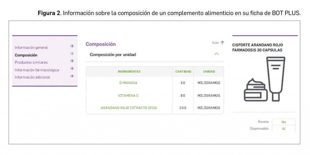 De forma similar, en el campo de la parafarmacia se está avanzando actualmente en la codificación de la composición de los productos cosméticos, complementos alimenticios, productos sanitarios y biocidas. Por ejemplo, en la ficha de los complementos alimenticios se puede observar la composición de los nutrientes o de sustancias con un efecto nutricional o fisiológico (Figura 2).