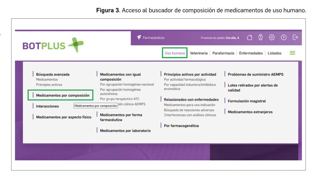 Para buscar medicamentos de uso humano por su composición, desde el menú desplegable superior se puede acceder a la opción de uso humano y al buscador por composición (Figura 3).