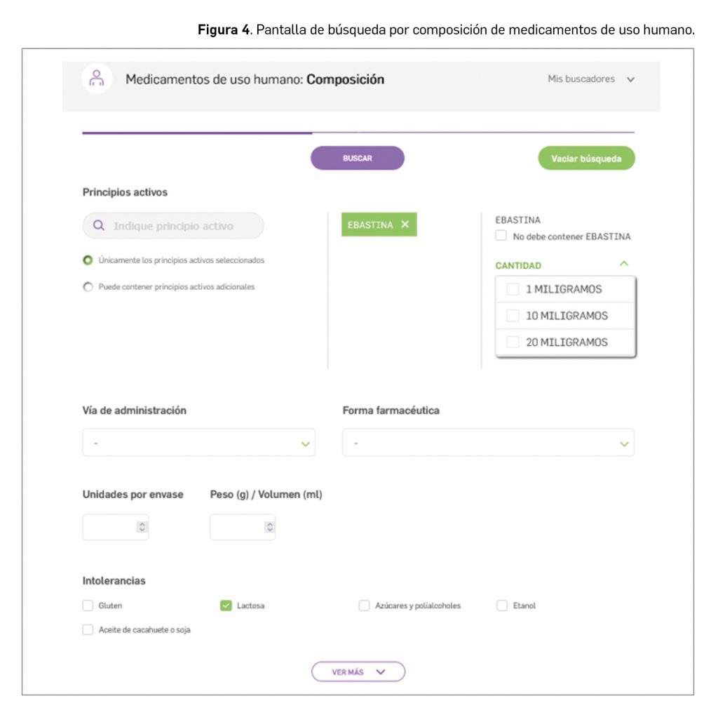 A través de esta pantalla se puede generar un listado de medicamentos con uno o más principios activos concretos (con la opción de incluir también la sal y/o cantidades concretas) y/o uno o varios EDO, o solo un principio activo sin estos últimos. Asimismo, se pueden definir otros criterios de búsqueda: forma farmacéutica, vía de administración, unidades del envase o peso/volumen (Figura 4).