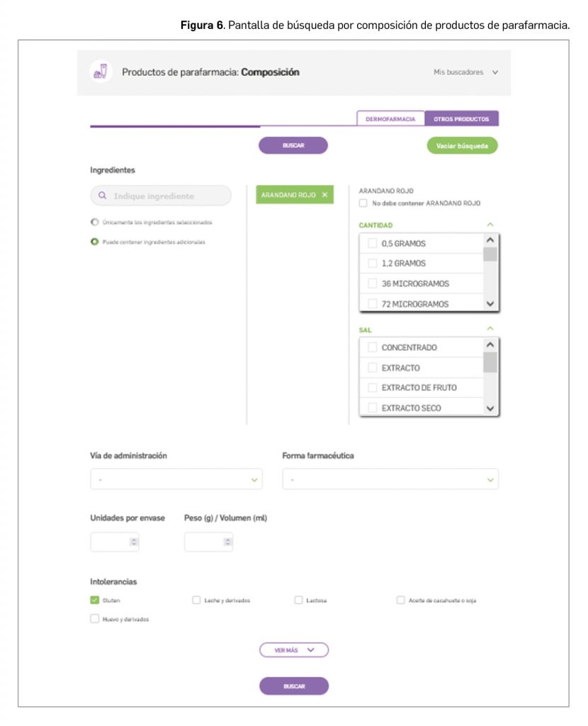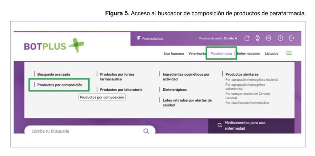 Por otro lado, a la búsqueda de productos de parafarmacia por su composición se podrá igualmente acceder desde el menú desplegable superior, en este caso a través de la opción de parafarmacia y al buscador por composición (Figura 5).