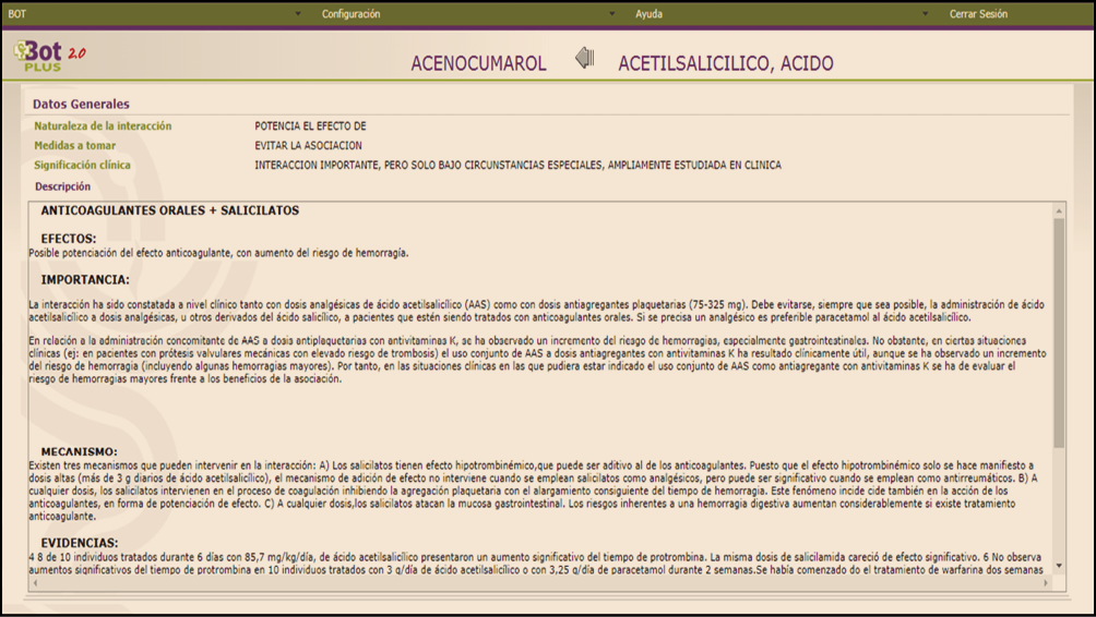Además, Bot PLUS facilita al profesional una adecuada evaluación de la interacción mediante las fichas de interacciones que presentan la información específica sobre sentido, naturaleza y significación clínica de la interacción, y medidas a tomar. El texto detallado se divide en cinco epígrafes: efecto, importancia (donde se reflejarían, si los hubiera, consejos al paciente), mecanismo, evidencias y referencias bibliográficas. Ver Figura 4.