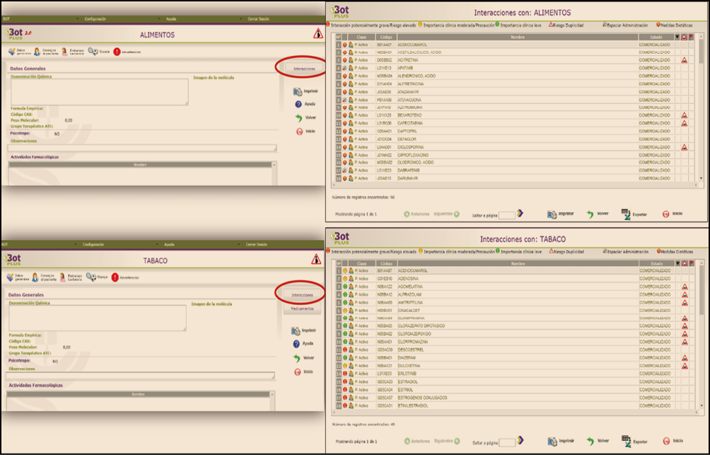 Figura 5. Ejemplo de ficha y listado de interacciones para “Alimentos” o “Tabaco”.