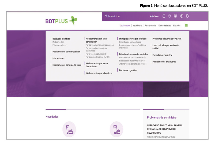 En esta nueva versión de BOT PLUS existen multitud de buscadores que permiten encontrar productos que cumplan con los criterios establecidos por cada usuario, y que ya se incluían en la anterior versión. No obstante, estos buscadores son ahora más accesibles, al haberse incluido en todas las pantallas en forma de menú desplegable (Figura 1).