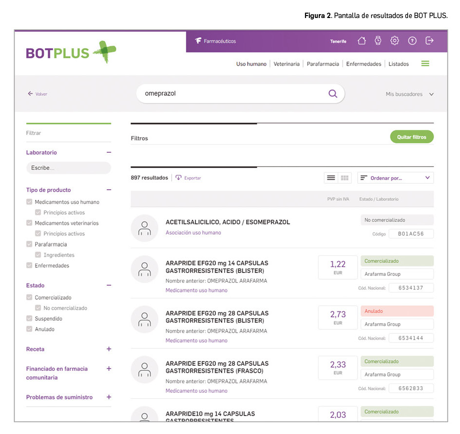 Independientemente del buscador seleccionado, los listados generados por BOT PLUS organizan la información incluida para facilitar la consulta por parte del usuario. Esta pantalla de resultados (Figura 2) muestra las siguientes informaciones: