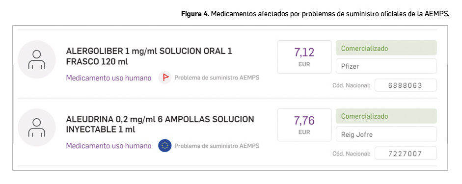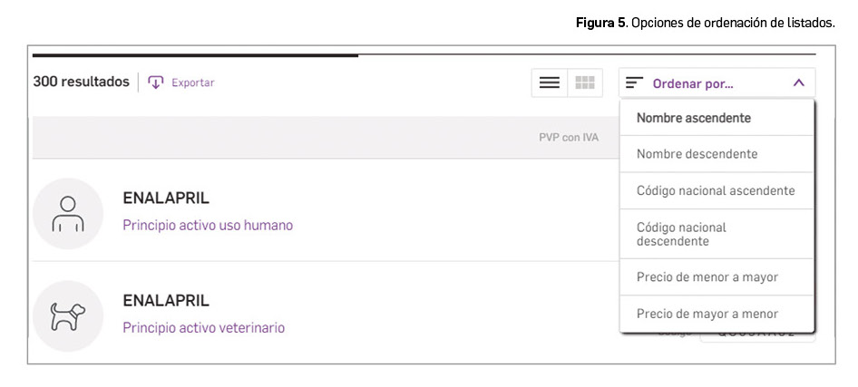 El listado obtenido se puede mostrar en forma de lista, o bien en forma de cuadrícula (grid). De igual manera, podemos modificar los criterios de ordenación de este listado, por nombre, código nacional o precio, y de forma ascendente o descendente (Figura 5).