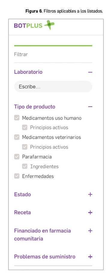 Una importante novedad incluida en la nueva versión de BOT PLUS es la capacidad de aplicar una serie de filtros al listado obtenido, de forma que podamos restringir aún más los criterios de búsqueda (Figura 6). De tal manera, podemos filtrar todos los registros obtenidos por laboratorio, tipo de producto, estado de comercialización, necesidad de receta para su dispensación, posible financiación en farmacia comunitaria o existencia de un problema de suministro. Para aplicar cualquiera de estos filtros, basta con pulsar sobre la opción deseada.
