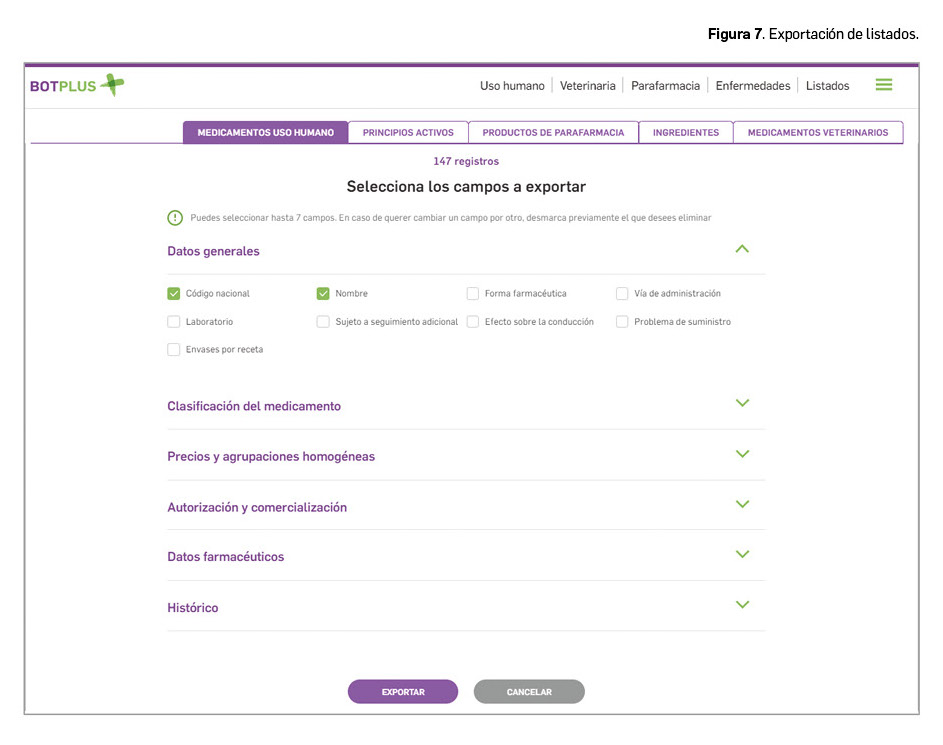 Finalmente, y como en la versión anterior del programa, existe la posibilidad de exportar la información de los productos del listado que hayamos obtenido a un fichero Excel. Para ello, podemos pinchar en la opción “Exportar” existente en la parte superior de la pantalla. Al pinchar en ese enlace, el programa permitirá seleccionar qué tipo de registros desea exportarse (por ejemplo, medicamentos de uso humano, productos de parafarmacia, etc.), y dentro de cada uno de estos registros, los campos concretos que se desea que aparezcan en el fichero generado (Figura 7).