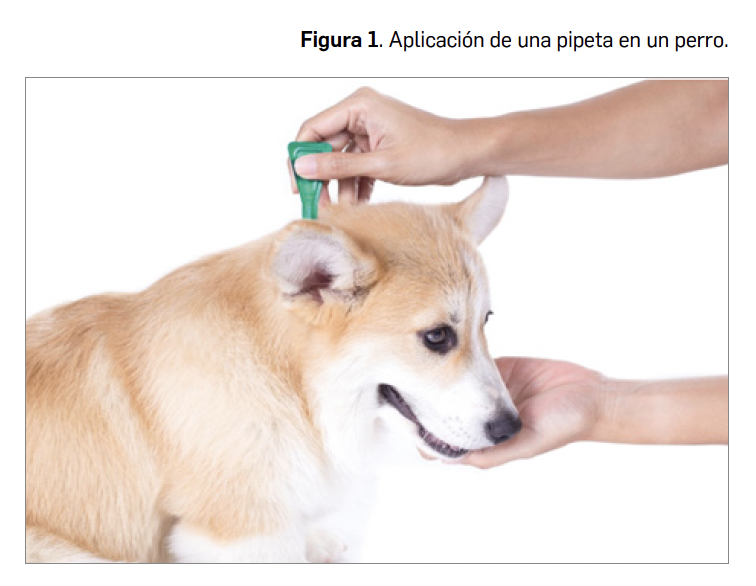 La dosificación de las pipetas antiparasitarias se realiza según el peso del animal. Por ejemplo, una pipeta que contenga 268 mg de fipronilo en 2,68 ml se utiliza en perros con un peso de 20-40 kg. La administración se realizará manteniendo la pipeta en posición vertical (Figura 1) y separando el pelaje del animal hasta que la piel quede visible. Una vez hecho esto, se coloca la punta de la pipeta directamente contra la piel exterior y se aprieta ligeramente varias veces la pipeta para vaciar totalmente su contenido. Se recomienda dar golpecitos en la parte estrecha de la pipeta con el fin de asegurarse de que el contenido de la pipeta permanezca en el cuerpo principal de la misma. Repetir el procedimiento en uno o dos puntos distintos a lo largo del lomo del animal.