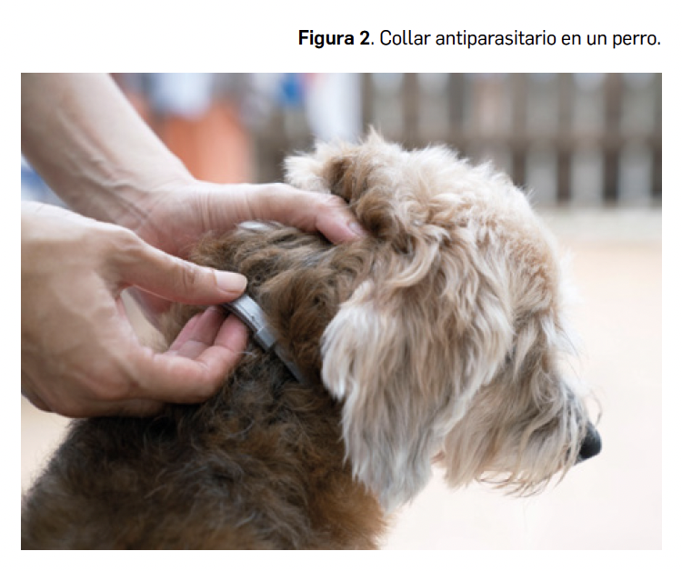 Por otra parte, los collares antiparasitarios (Figura 2) funcionan desprendiendo progresivamente el fármaco sobre la piel del perro. Según la marca, su efecto puede durar entre 6-8 meses. Presenta algunas ventajas importantes respecto a la pipeta, como por ejemplo que la duración del efecto es mayor, es más económico (la unidad es más cara pero el efecto es más duradero), no huele, no es tóxico a menos que el animal lo muerda y se puede bañar al perro con el collar puesto. Entre sus inconvenientes, quizás el más importante es que solo previene la parasitación, es decir que, si el animal ya tiene el parásito, el collar no lo erradicará.
