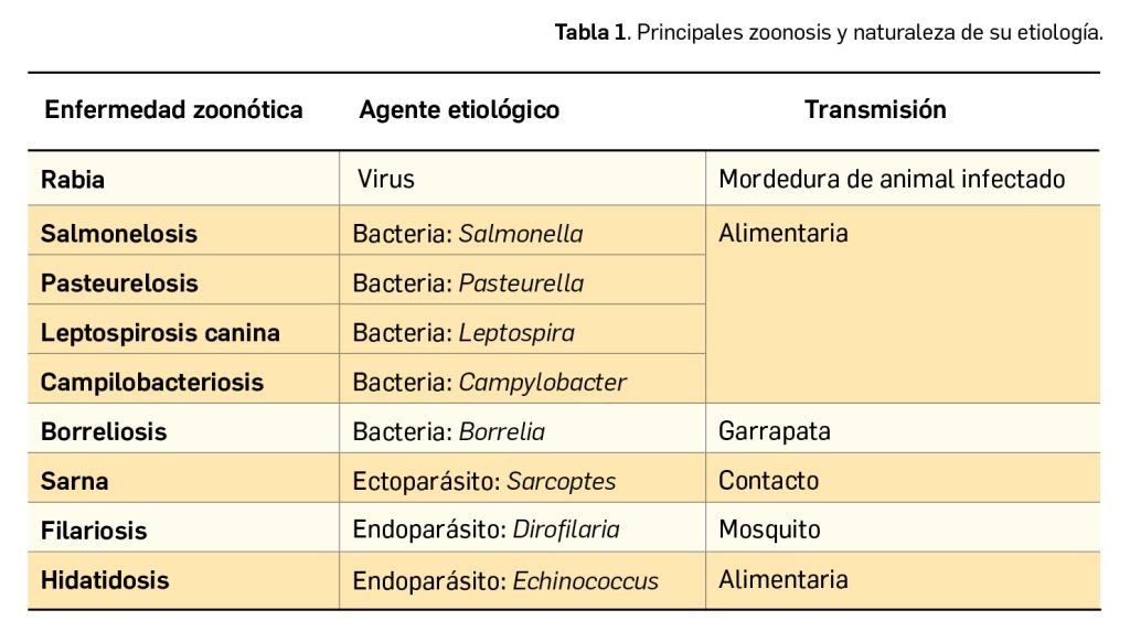 Se denominan ectoparásitos a aquellos patógenos que viven sobre el pelo y la piel de los animales, por ejemplo, las pulgas, las garrapatas y los mosquitos. Son bastante peligrosos, ya que también transmiten algunos de los parásitos internos (endoparásitos), que pueden dar lugar a zoonosis. Por ejemplo, las pulgas transmiten tenias, las garrapatas la ehrlichiosis o la borreliosis y los mosquitos flebotomos son los transmisores de la leishmaniasis. En la Tabla 1 se indican las zoonosis más frecuentes y su etiología.