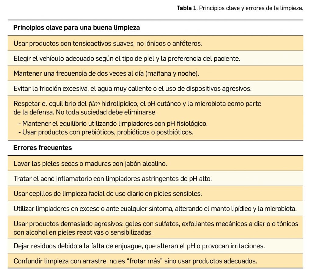 La limpieza posee valor terapéutico y preventivo; prepara la piel, la protege y mejora la eficacia de lo que venga después. El objetivo principal es retirar impurezas sin comprometer la función barrera de la piel (Tabla 1).