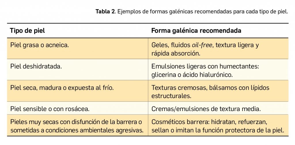 Las cremas hidratantes actuales, además de hidratar, buscan restaurar la arquitectura funcional del estrato córneo, actuando sobre los mecanismos que regulan el contenido hídrico. Desde la farmacia debemos prevenir la disfunción de la barrera, además de repararla y reforzarla en situaciones de vulnerabilidad. La entrevista juega aquí un papel clave para que el farmacéutico valore el origen del problema, siendo imprescindible que elija un producto con los ingredientes y la forma galénica más adecuada de forma personalizada, para mejorar la experiencia del paciente (Tabla 2).