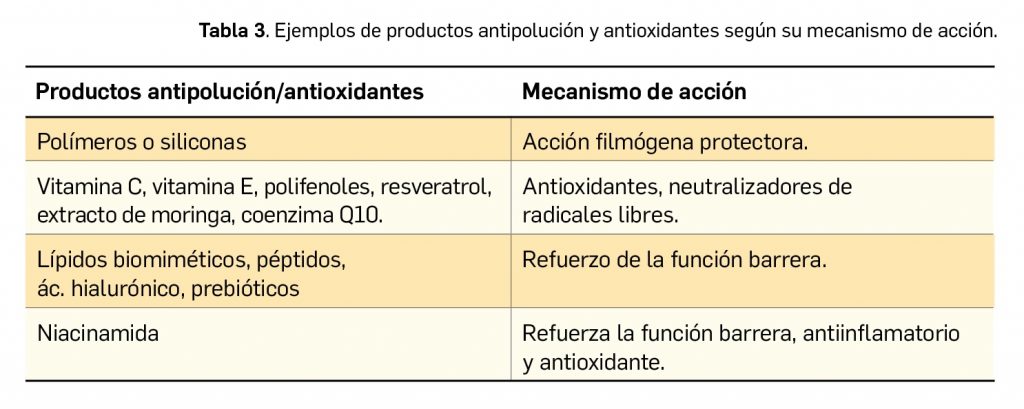 Además, debemos protegernos frente a la polución que se deposita en la piel y que puede alterar la microbiota, así como colarse por los folículos, activando rutas inflamatorias y generando radicales libres, los cuales también se forman por estrés, falta de sueño, tabaco o alcohol. Contra todo esto existen productos “antipolución” y antioxidantes que se detallan en la Tabla 3.