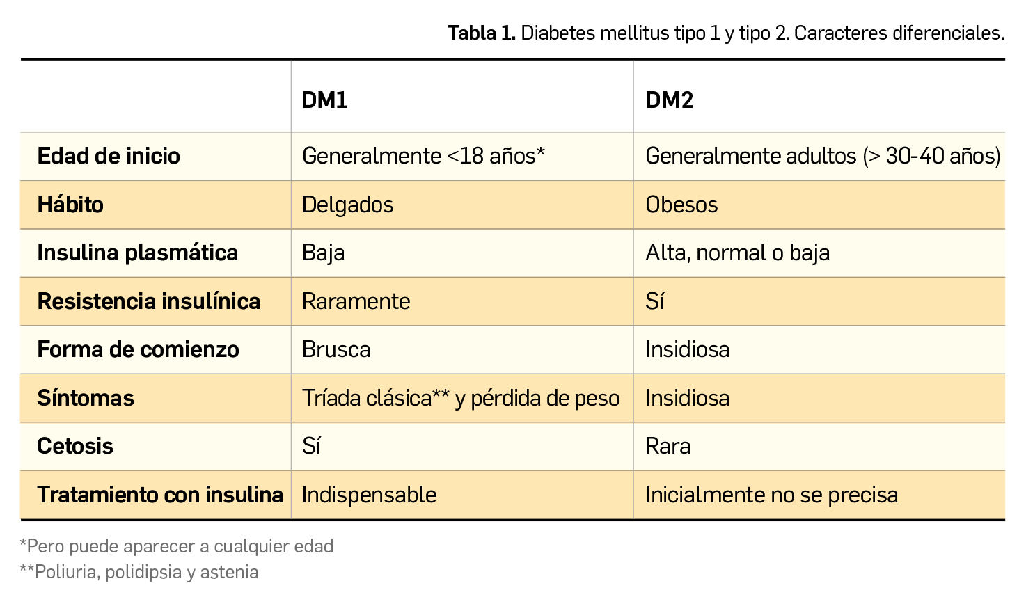 - La DM1 se caracteriza por debutar con una serie de síntomas cardinales: polidipsia, poliuria, polifagia, pérdida de peso y astenia, que ocurren como consecuencia de la diuresis osmótica, hipertonicidad del medio interno e imposibilidad para traslocar los transportadores GLUT para importar los glúcidos ingeridos.