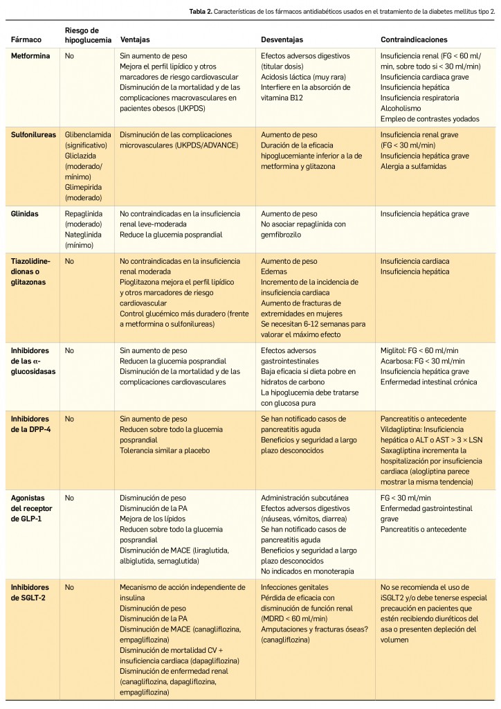 La asociación de metformina con sulfonilureas es la combinación más estudiada y ha demostrado su eficacia y seguridad, aunque su uso está asociado a una mayor tasa de hipoglucemias y de aumento de peso. Las glinidas constituyen una buena alternativa a las sulfonilureas en pacientes con ingestas más irregulares por su corto periodo de acción.