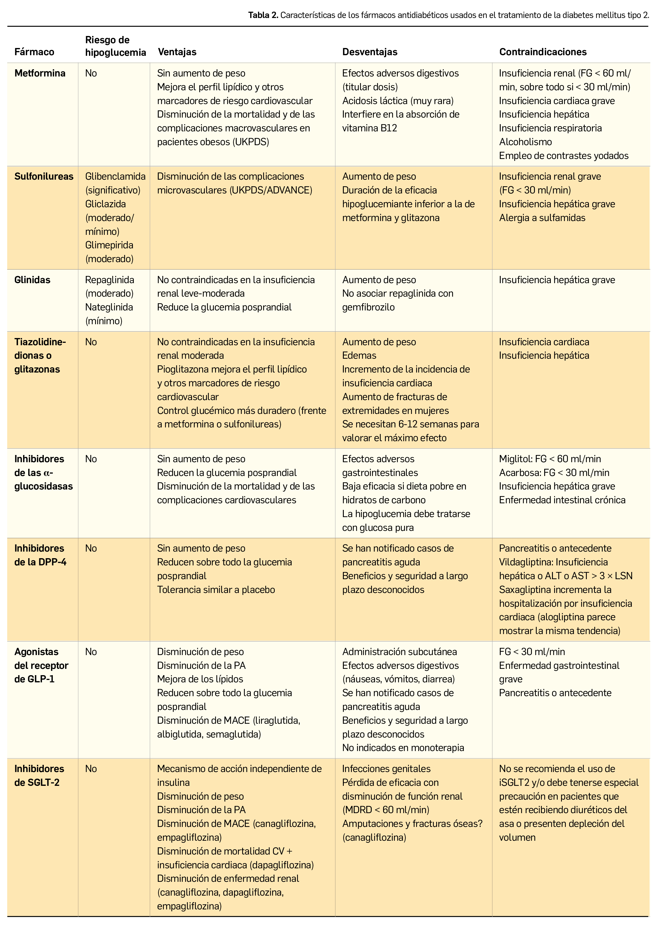 En pacientes motivados con una HbA1c alrededor del 7,5%, se puede dar una oportunidad a la modificación del estilo de vida durante un periodo de 3-6 meses antes de iniciar el tratamiento farmacológico. Si la hiperglucemia es moderada, o si se prevé que la modificación del estilo de vida no dará resultado, se iniciará tratamiento farmacológico (Tabla 2) desde el diagnóstico (generalmente metformina), que podrá ser modificado o suspendido posteriormente. En el caso de que no se pueda utilizar metformina, podrá elegirse otro fármaco oral (sulfonilurea/glinida, pioglitazona, iDPP-4, arGLP-1 o iSGLT-2).