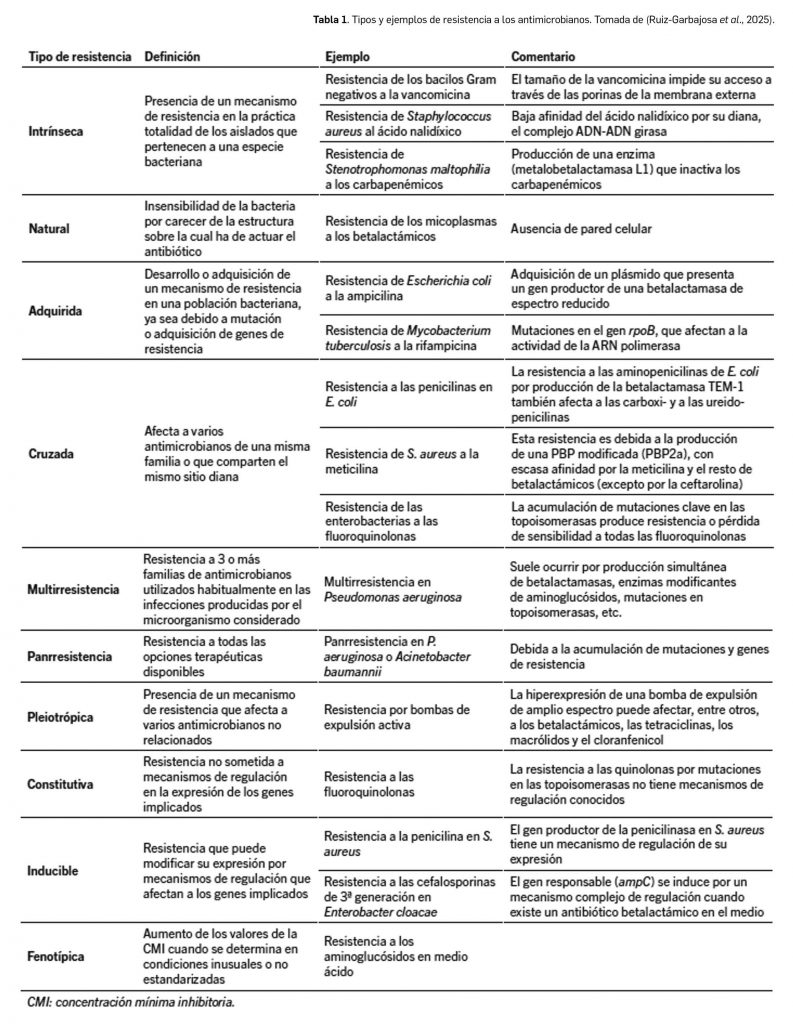 Existen diferentes tipos de resistencias a los antimicrobianos, las principales se recogen en la Tabla 1. Un microorganismo presenta resistencia natural a un antibiótico cuando es insensible a la acción de éste por no disponer de la diana de acción. Un ejemplo de ello serían los micoplasmas y los antibióticos betalactámicos, ya que dichos microorganismos carecen de pared celular, diana de estos compuestos.