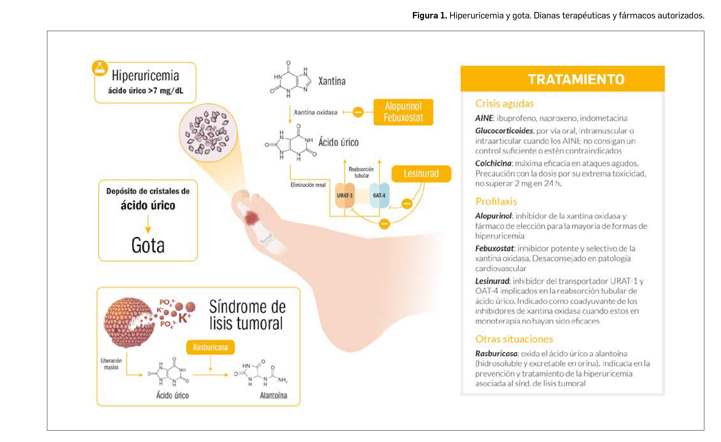 El producto final del catabolismo de los nucleótidos purínicos es el ácido úrico, un producto de naturaleza muy poco soluble que es excretado con la orina bajo la forma de cristales de urato monosódico. Una de las enzimas que interviene en este proceso es la xantina oxidasa, diana de los principales fármacos utilizados en el manejo terapéutico de la hiperuricemia.