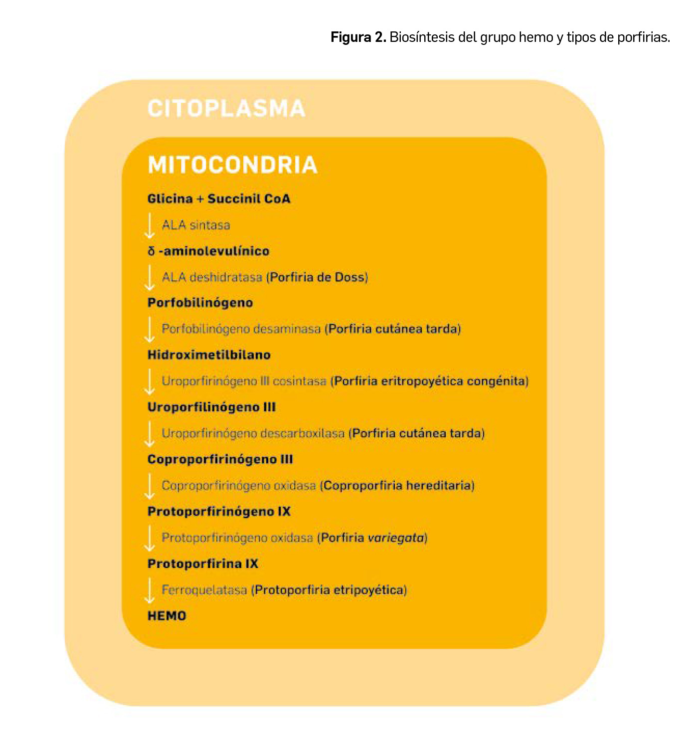 La inactividad parcial o completa de una o varias enzimas participantes en la síntesis del grupo hemo origina un cuadro clínico conocido como porfiria (Figura 2), caracterizado, fundamentalmente, por la aparición de neuropatía, lesiones cutáneas, o la asociación de ambas.