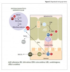 La degradación del grupo hemo procedente de la hemoglobina y otras proteínas comienza en el sistema fagocítico mononuclear (SFM) (Figura 3), donde es transformado en biliverdina por acción de la hemooxigenasa, y posteriormente en bilirrubina por la biliverdina reductasa. La bilirrubina accede al plasma, donde es captada por los hepatocitos. Una vez en el retículo endoplasmático liso, sufre un proceso de conjugación con ácido glucurónico por acción de la UDP glucuroniltransferasa, dando lugar a bilirrubina conjugada, que posteriormente será transformada en urobilinógeno y eliminado mayoritariamente por vía fecal.