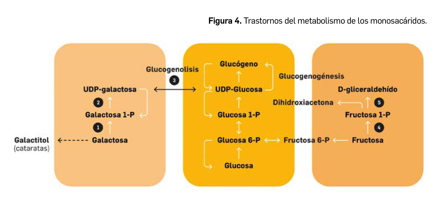 Se incluyen en este grupo los errores del metabolismo de monosacáridos como la galactosa y la fructosa. En la Figura 4 se representa el metabolismo de estos glúcidos.