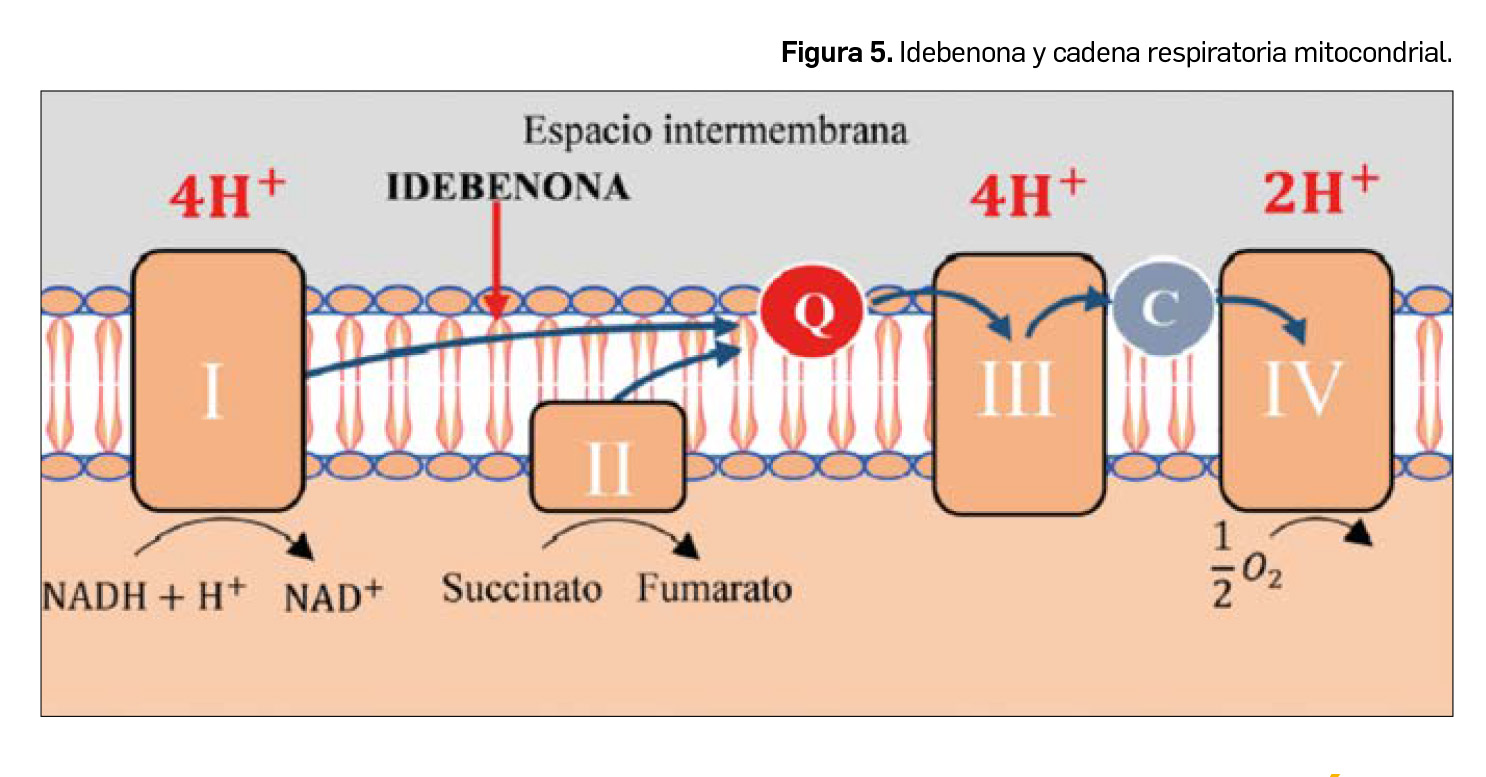 tratamiento con idebenona (Figura 5), una benzoquinona análoga de la coenzima Q10 que actúa transfiriendo directamente los electrones desde el complejo I (afectado por las mutaciones) al complejo III de la cadena respiratoria mitocondrial, restaurando así la producción de ATP celular.
