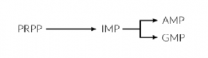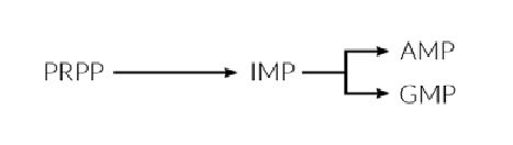 La biosíntesis de nucleótidos purínicos (adenina, guanina) comienza con PRPP y conduce al primer nucleótido purínico completo, la inosina-5´-monofosfato (IMP), que constituye el punto central del proceso, ya que puede ser convertido tanto en AMP como en GMP, a través de dos rutas metabólicas diferentes.