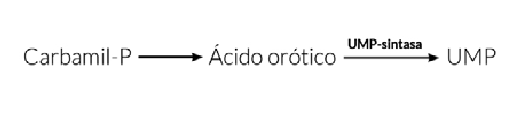 La síntesis de pirimidinas es más simple que la de bases purínicas. El punto de partida es el carbamil-fosfato, que se condensa con el aspartato para generar ácido orótico u orotato, y que, gracias a la acción de la enzima bifuncional UMP sintasa, generará el nucleótido uridilato (UMP):