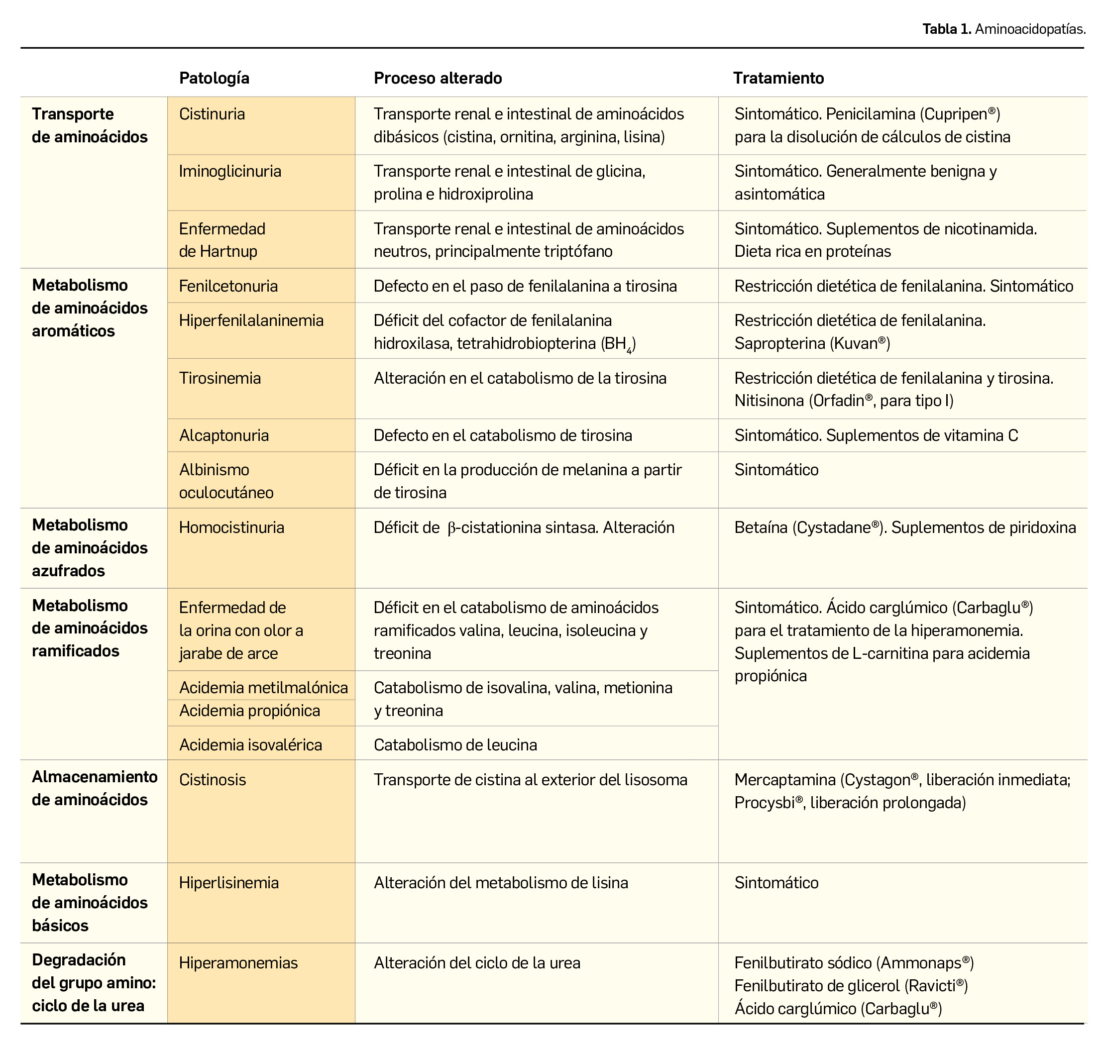 El abordaje terapéutico de tales alteraciones pasa por reducir el aporte de proteínas de la dieta, suplementar con arginina o citrulina en aquellos casos en los que proceda, y proporcionar una vía alternativa de eliminación del nitrógeno metabólico. El fenilbutirato sódico y, más recientemente el fenilbutirato de glicerol, consiguen disminuir los niveles plasmáticos de amoníaco. Específicamente, el ácido carglúmico está indicado en pacientes con hiperamonemia debida a la deficiencia de N-acetilglutamato sintasa. En la Tabla 1 se recogen las principales aminoacidopatías clasificadas según la parte de la ruta metabólica alterada, con indicación del tratamiento recomendado.