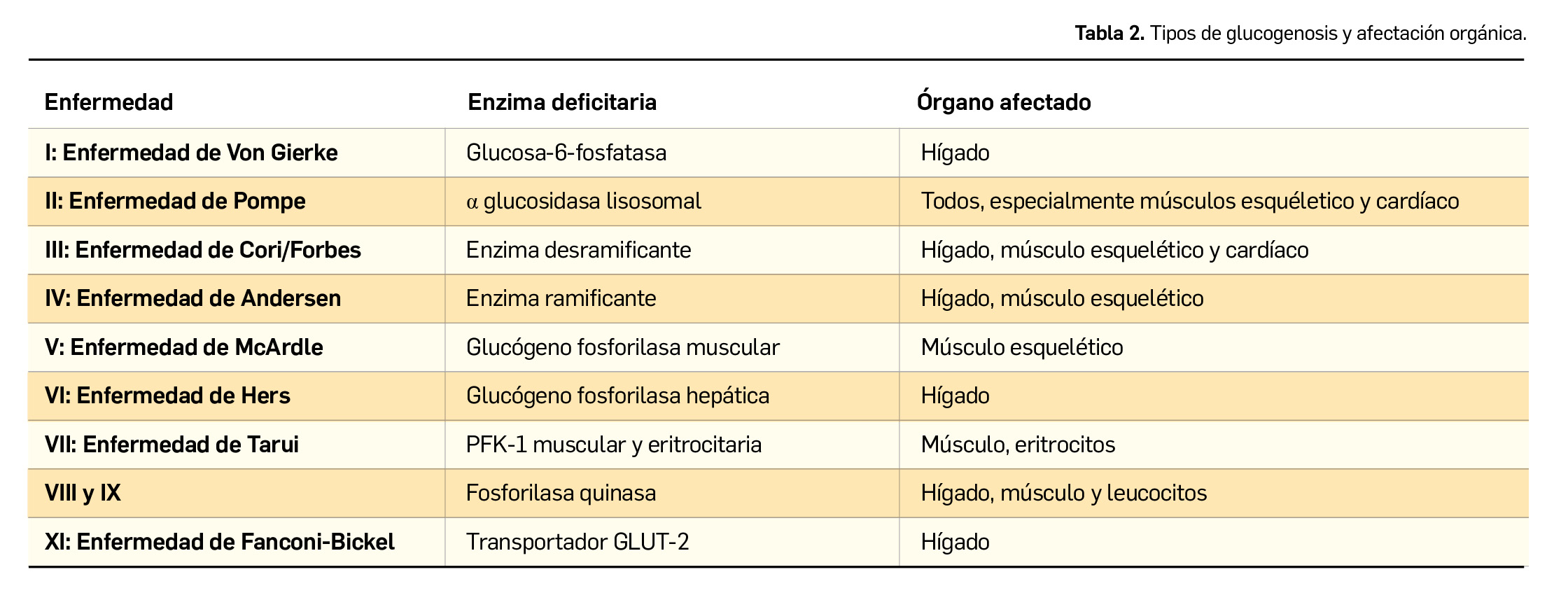 Constituyen un grupo de enfermedades del almacenamiento del glucógeno que pueden afectar al hígado, a los músculos o a ambos (Tabla 2). La enfermedad de Pompe, causada por el déficit de la enzima desramificante, es la única frente a la cual se dispone de tratamiento específico, mediante terapia de sustitución enzimática con alglucosidasa α.
