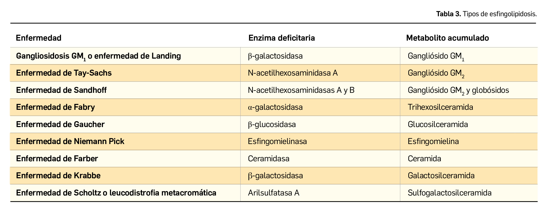 Constituyen un conjunto de enfermedades metabólicas hereditarias producidas por la ausencia total o parcial de las enzimas encargadas de la degradación de esfingolípidos, resultantes de la unión de la ceramida, unidad básica estructural, a un resto glucídico. Las distintas esfingolipidosis se recogen en la Tabla 3.