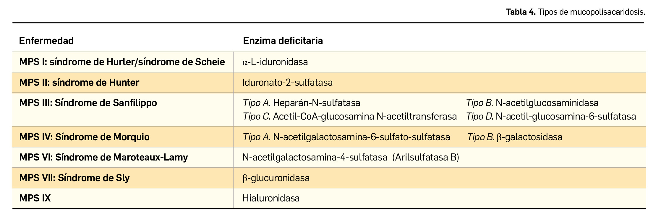 Representan un conjunto de enfermedades producidas por la deficiencia de alguna de las enzimas responsables de la degradación lisosomal de mucopolisacáridos (Tabla 4).