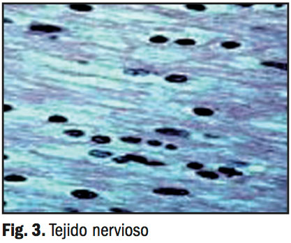 - Tejido neurológico: el tejido nervioso, observable en la Figura 3 y por el contrario del óseo, es un tejido que no presenta propiedades mecánicas tan estrictas de tenacidad o elasticidad. Sin embargo, presenta otras necesidades que podríamos considerar más específicas como la conductividad eléctrica. Las células madre más empleadas para este tipo de tejido son las células madre neuronales debido a su capacidad de autorrenovación y diferenciación hasta neuronas, astrocitos y oligodendrocitos. Varios materiales van a ser empleados para la fabricación de matrices extracelulares artificiales para las células madre neuronales. Uno de los más prometedores y empleados son los nanotubos de carbono. Esto es debido a que facilitan la diferenciación hacia linajes neuronales gracias a sus excelentes propiedades eléctricas que propician y facilitan la transmisión de señales entre neuronas7.