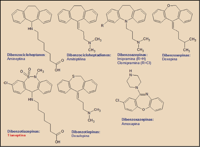 Además del núcleo central, determinante de la actividad antidepresiva, estos fármacos presentan restos laterales que modulan dicha actividad, potenciando o reduciendo la actividad – generalmente inhibidora – sobre otros múltiples receptores celulares (histamina, acetilcolina, etc.). En el caso de la tianeptina, presenta un peculiar resto de ácido hepatanoico que solo es compartido con la amineptina y que se asocia con algunas peculiaridades farmacológicas, especialmente con la modulación de la transmisión glutamatérgica, mecanismo al que se atribuye un papel relevante en los efectos de la tianeptina sobre la neurogénesis y el remodelado de las dendritas neuronales.