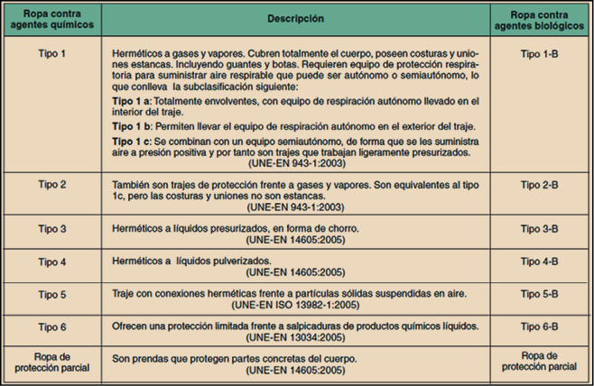 Tabla 2: Requisitos de los trajes clasificación |