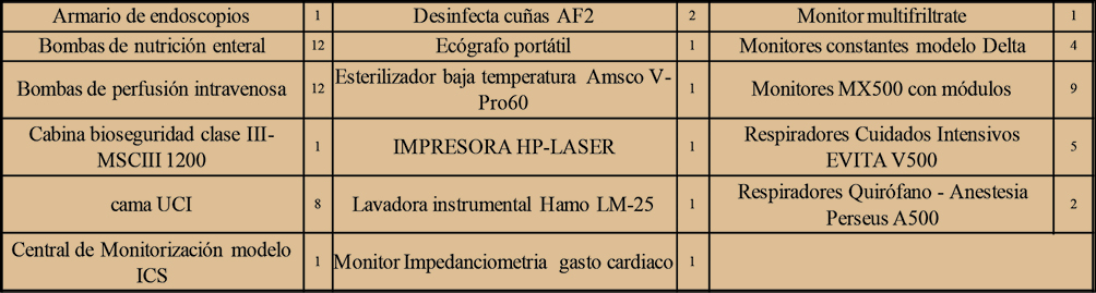 Además del material sanitario de un solo uso, la especificidad de la UAAN requiere la incorporación de diverso material de electromedicina, considerado inventariable. La adquisición de dicho material se realiza a través de la unidad de Gestión y consta de los siguientes aparatos y sistemas (Tabla 4).