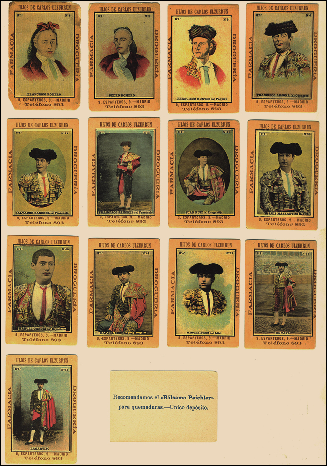 Sin meterse en estas honduras, nuestros antecesores publicitaron sus establecimientos y fármacos mediante impresos relacionados con la fiesta. Una de las piezas más curiosas de nuestra colección es una serie de 96 cromitos (6 x 4 cm) con unas magníficas litografías de las caras de los más famosos toreros de finales del siglo XIX y principios del XX. Los empleó la farmacia y droguería de los hijos de Carlos Ulzurrun para publicitar su establecimiento y en el dorso el bálsamo Perichler para quemaduras del que eran el único depósito (Figura 1). Ese bálsamo era una de las diez sustancias principales importadas de América y se empleaba de forma obligatoria en la Marina Española. Su composición aparece en el número 27 de La Farmacia Española: hiel de toro; aceite de oliva; espigas de la planta conocida como rabo de zorra, corteza de cedro; copal de la isla; raíz de Almácigo sacada en menguante de luna; alcohol rectificado; espíritu de trementina; brea prieta y pez rubia.