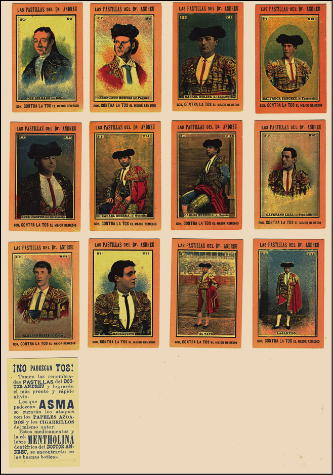 La coincidencia sirve para explicar cómo hay algunos reclamos preparados de manera expresa para un determinado fármaco o empresario y otros, simplemente, imprimían su propaganda sobre un soporte popular y en muchas ocasiones coleccionable; en éste caso, los cromos con representaciones de toreros fueron igualmente válidos para un fabricante catalán con implantación en todo el estado y para unos boticarios madrileños.