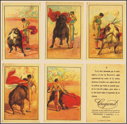 El Ceregumil de Fernández y Canivell SA, de Málaga, también editó otra serie de cromos (6,5 x 10 cm) de baja calidad, dedicados a las suertes interpretadas por Manolete, explicadas en el dorso de los mismos. Teniendo en cuenta que murió en 1947, se publicaría poco después de la guerra civil, lo que justifica en parte su poca nitidez (Figura 4).